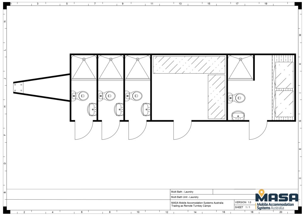 The Multi Bathroom & Laundry Unit by Quick Camps is a fully equipped facility designed to provide essential amenities for larger teams at remote sites. Featuring three washrooms with showers and a spacious laundry room, this unit ensures convenience, hygiene, and comfort for workforce accommodation in challenging environments.
